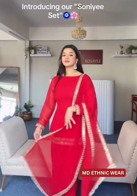 Soniyee Premium Suit – Bold Red with Classic Embroidery Border