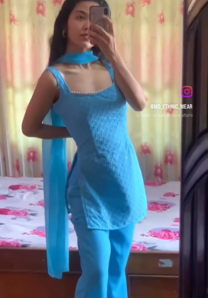 Stay effortlessly graceful in this premium Schiffli Georgette kurta set featuring delicate embroidery, pearl-edged neckline & matching pants with dupatta — perfect for timeless elegance. 🌸